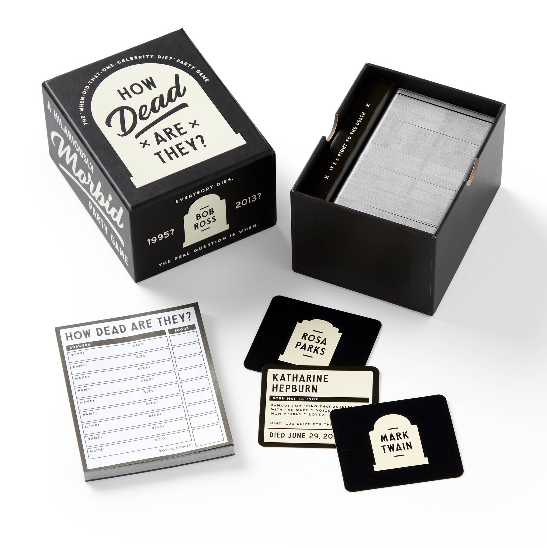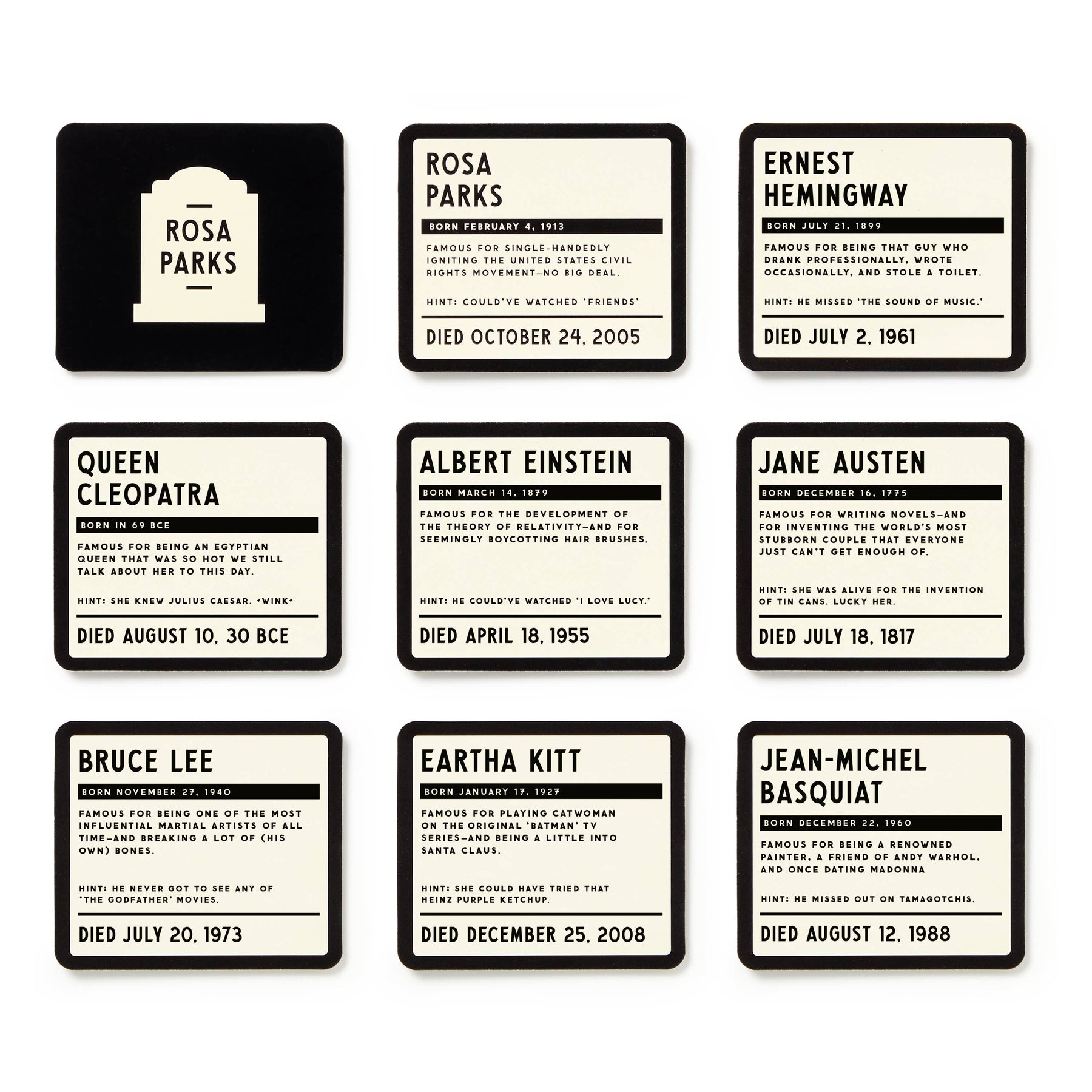 HOW TO PLAY - In this hilarious social game, players compete by putting their random celebrity and historical figure knowledge to the test–while trying to remember what year people died (or if they even have). When did Albert Einstein pass away? 1897? 1986? Don’t worry, we’ll provide a series of clever clues to help inform your guess–and the closest scores points.