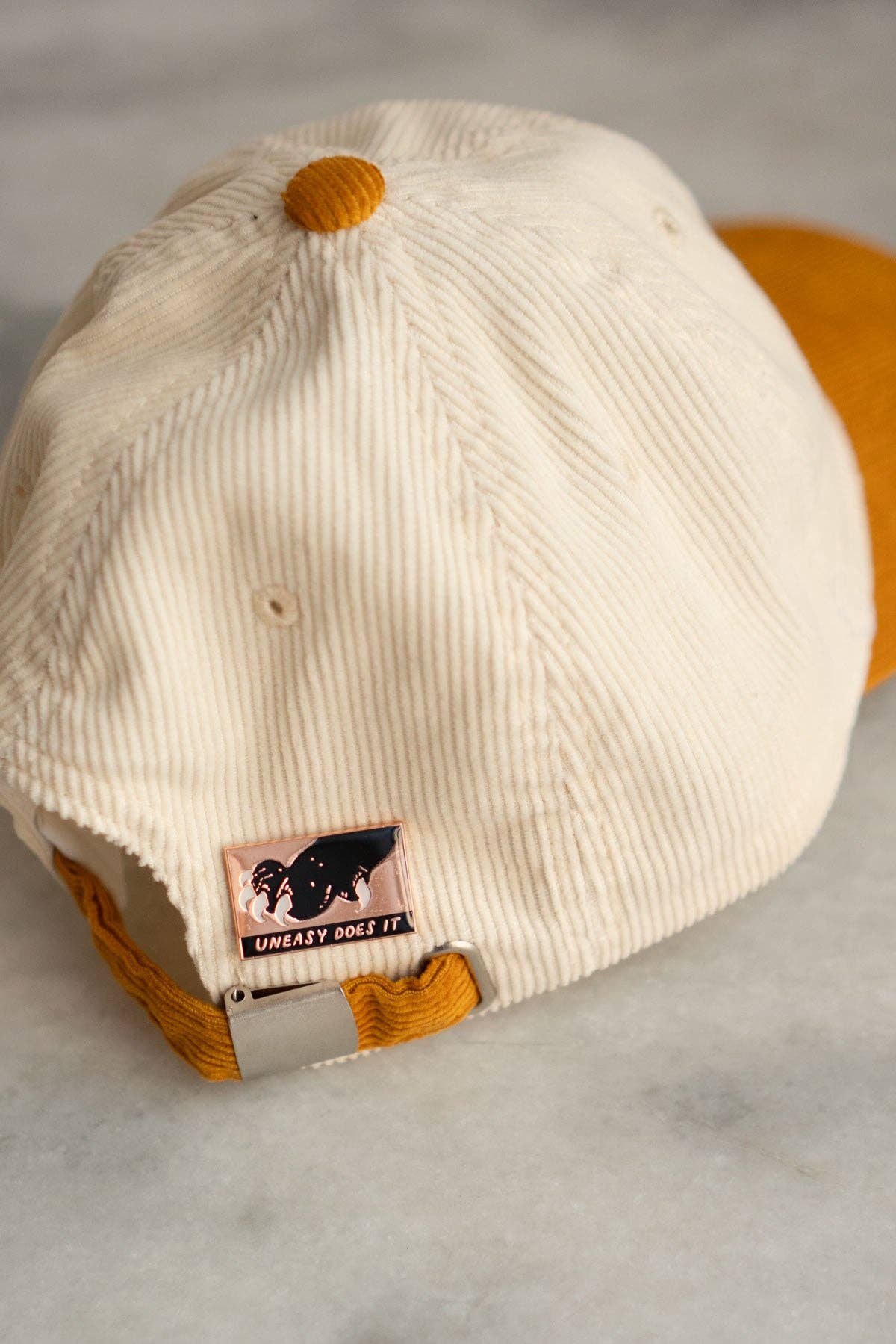 Uneasy does it - this cat's on edge. 1.25" wide lapel pin in rose gold toned metal and soft enamel with glossy epoxy coating. Comes on branded card with locking pinback.