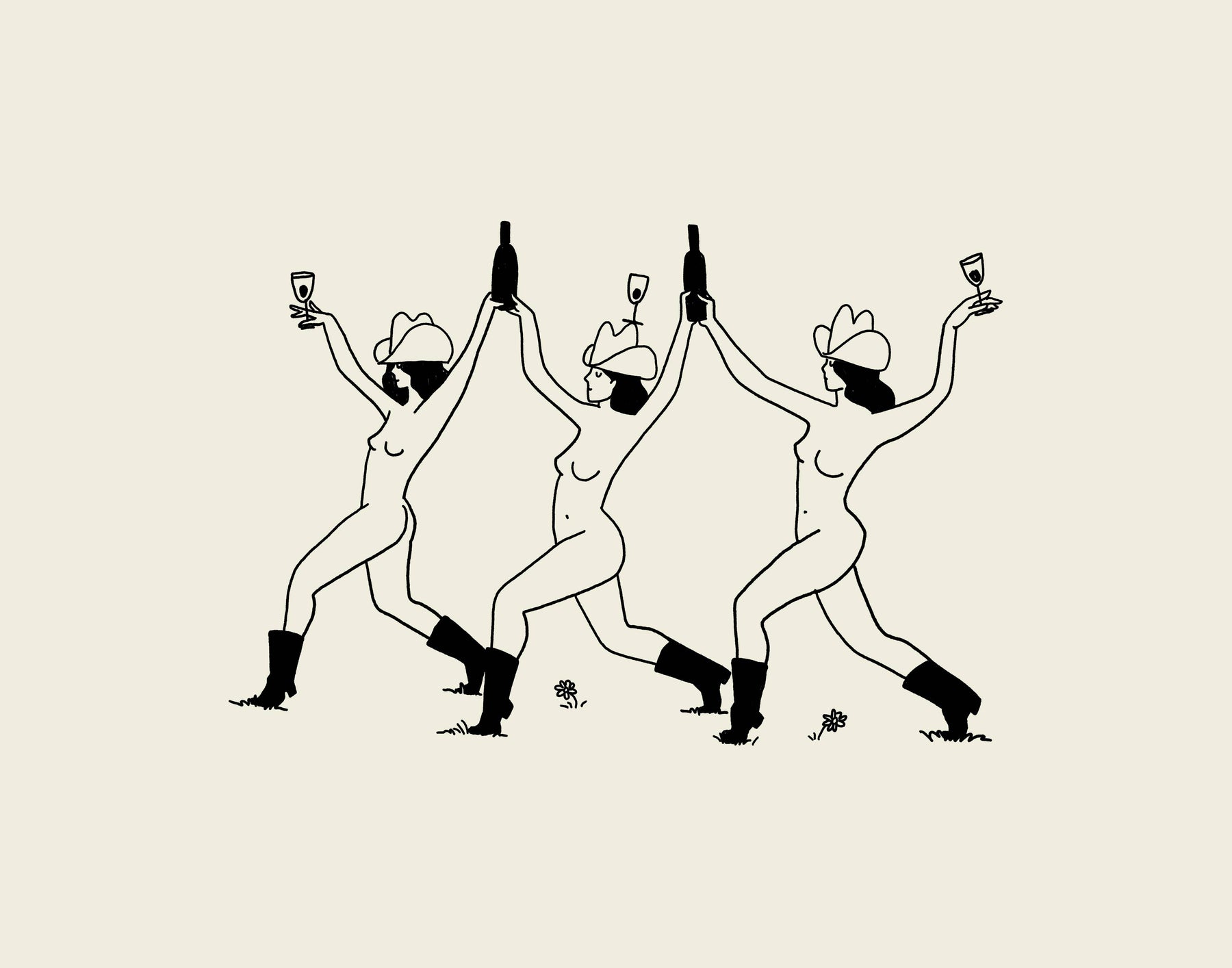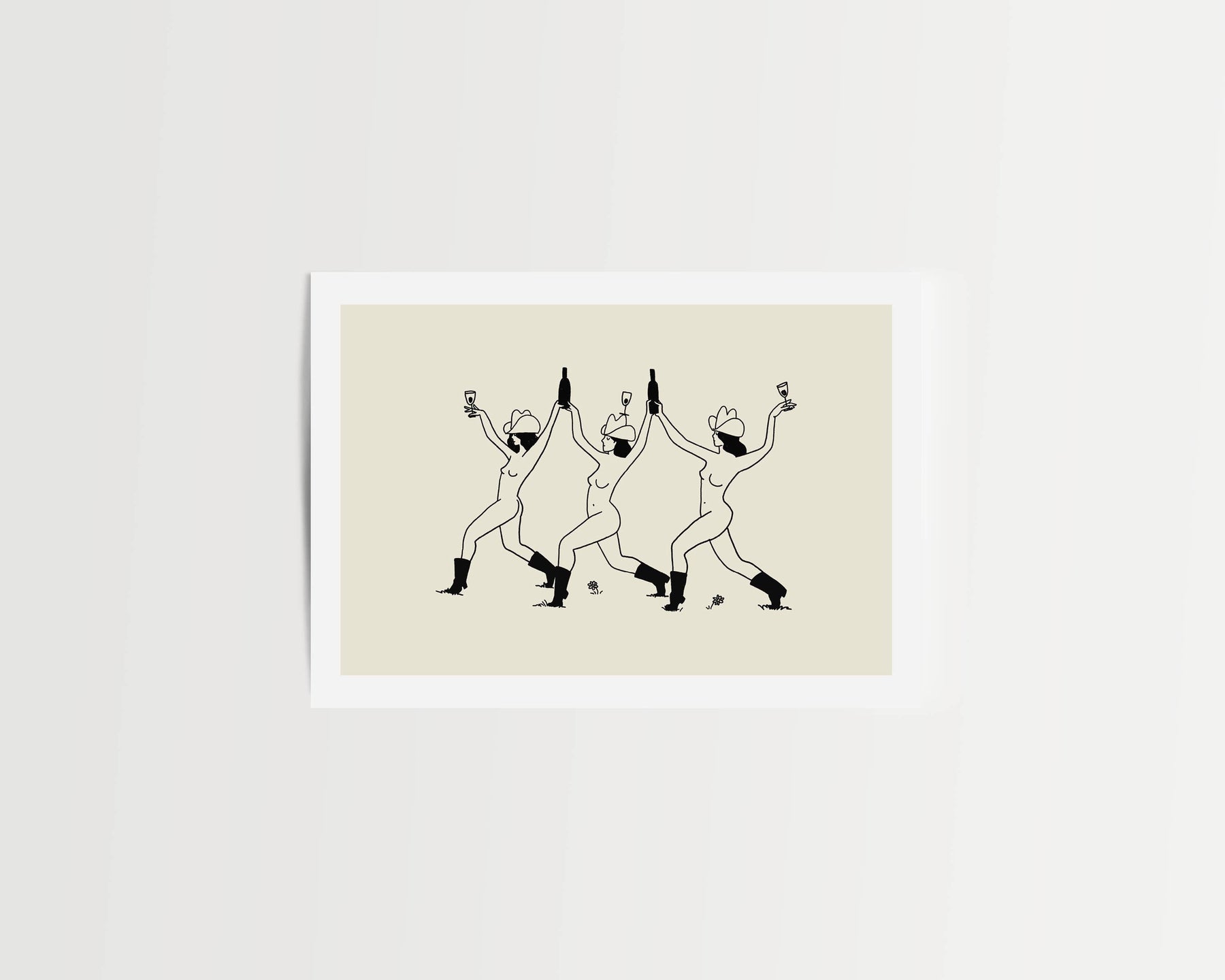 This unframed art print captures a delightful scene of three cowgirls sauntering through a field, ready to enjoy some wine. It's a fun, free-spirited piece of wall art that brings a touch of whimsy and camaraderie to any home decor collection.
