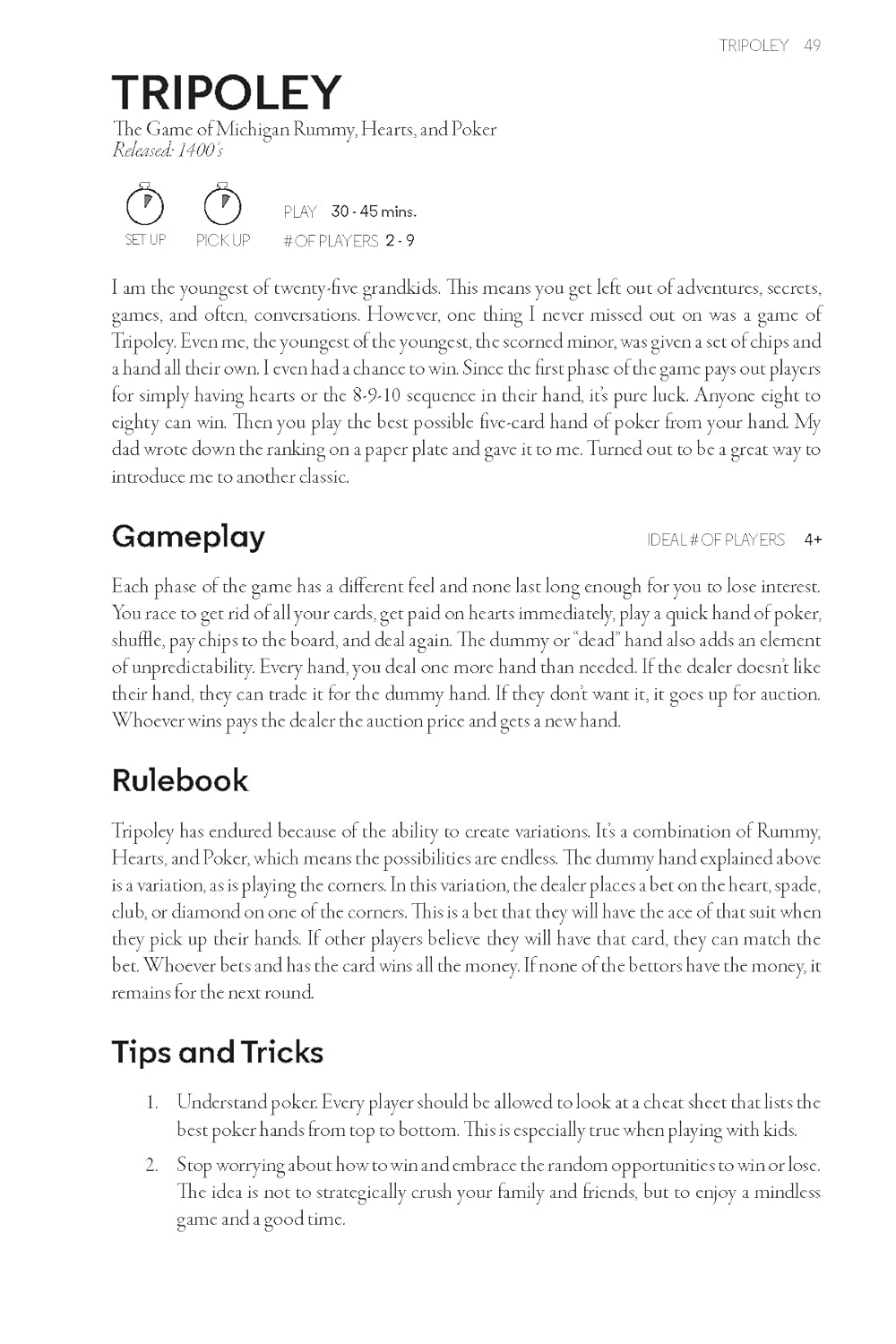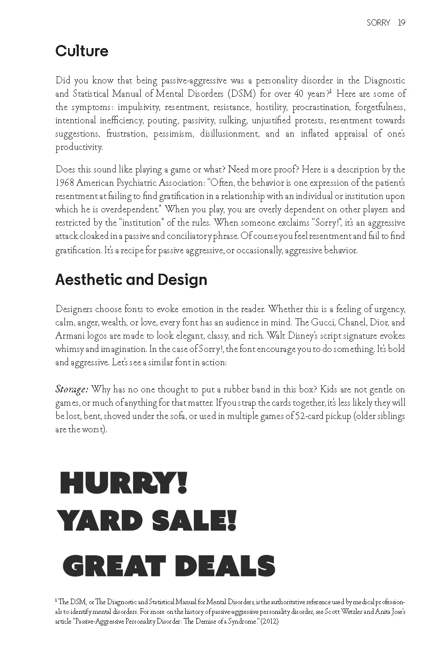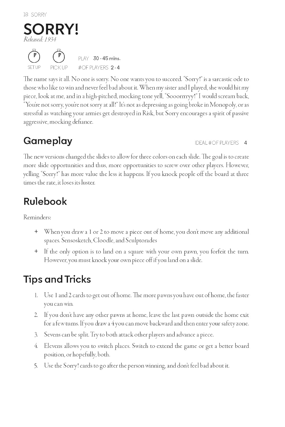 Most books about board games are boring. This is not that book. It’s games through the lens of family, psychology, archaeology, art, design, culture, and race. It’s about bad rulebooks (and some are really bad). It’s about how hexagons became the foundation of many contemporary games. It explains how the polio epidemic sparked the idea for Candyland. It explores why we have house rules in Uno? It also discusses layout, fonts, grids, color choice and cohesion. But don’t worry, games are there all along, rattling memories of your own nights playing Sorry, Yahtzee, Settlers of Catan, Monopoly, Scrabble, Boggle, Ticket to Ride, or any tabletop game you love.