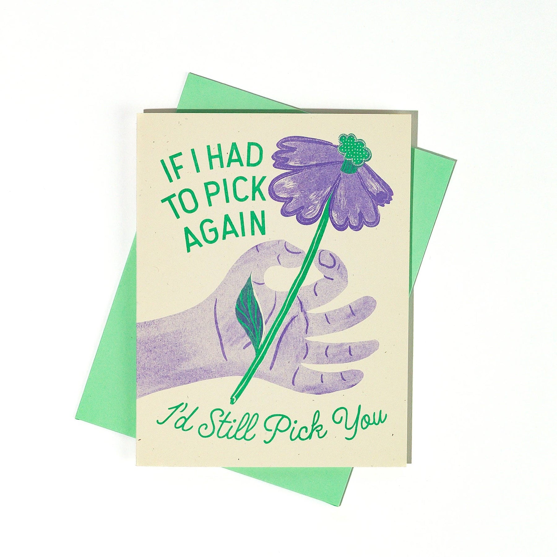A hand plucks a single flower. This card is a confirmation of love, that even if there was a do-over, it would always be you. Risograph printed in seafoam and violet.