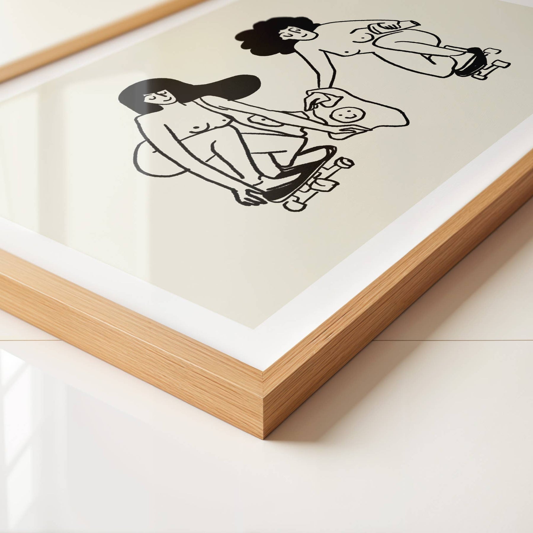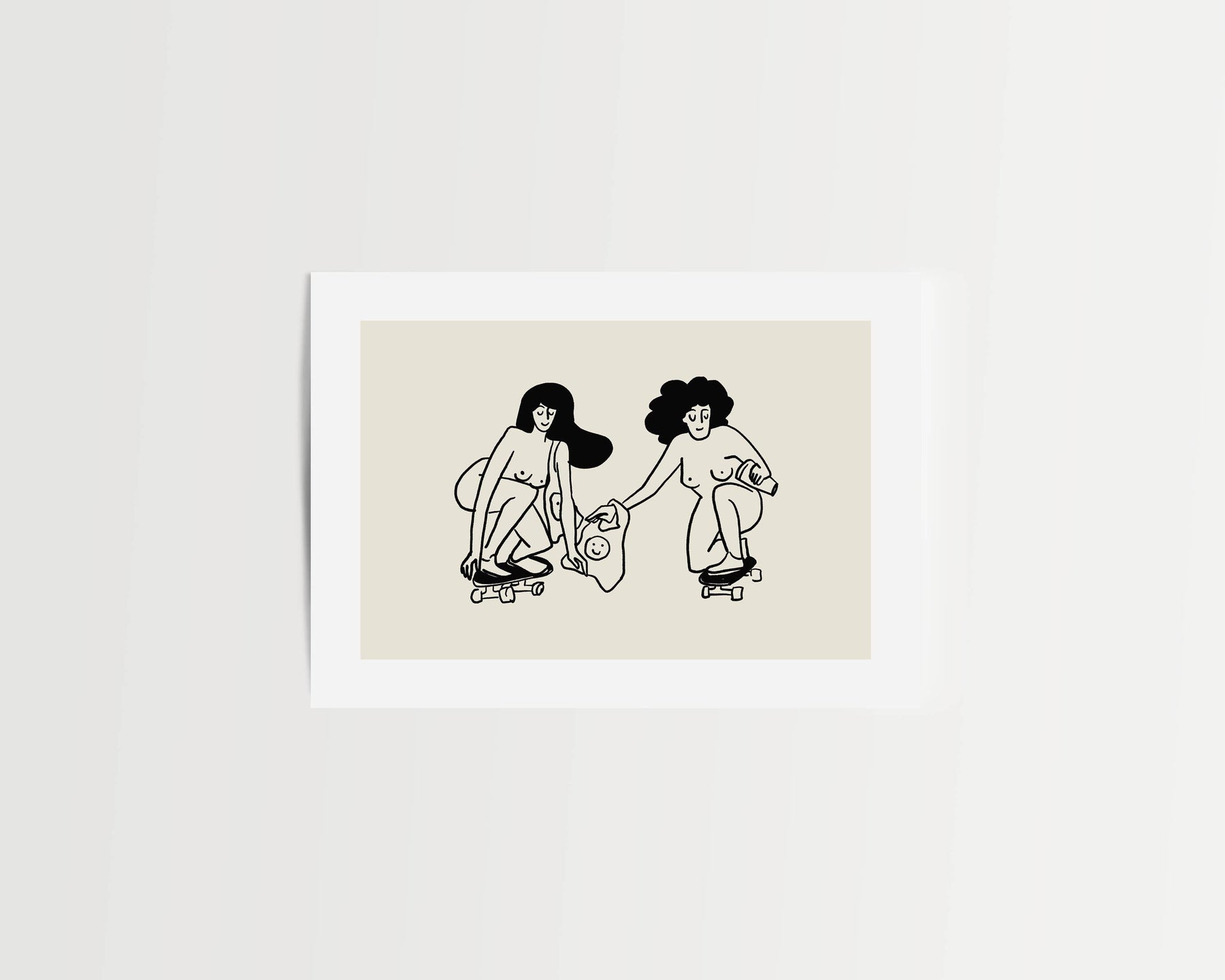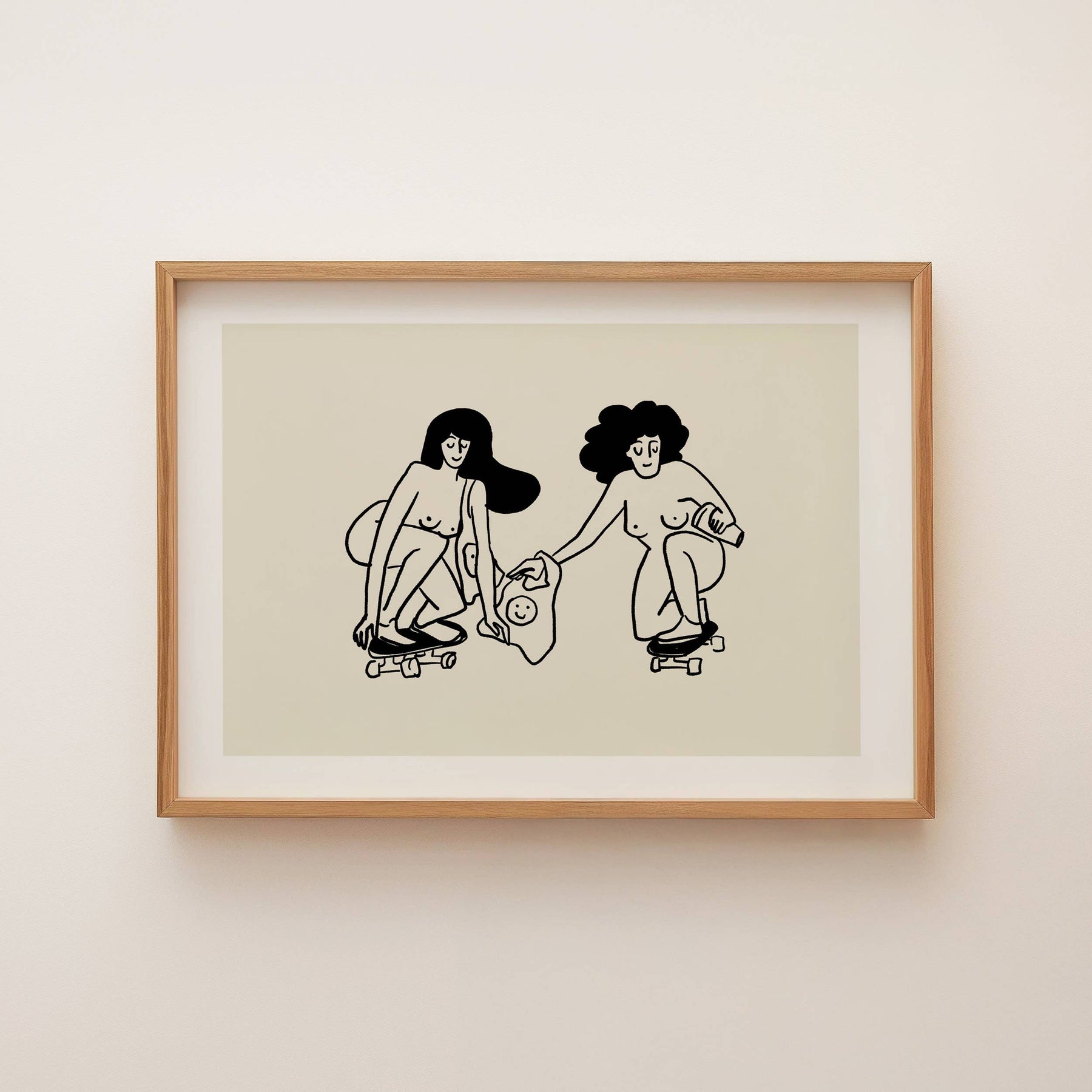 Give your customers a piece of wall art that celebrates friendship and good times. This unframed art print perfectly captures a fun "skate date," with two friends rolling back from the liquor store with their goods in hand. With its playful spirit and sketchy minimal style, it's a must-have for shops looking for a lively and relatable 90's skate cultureinspired print.