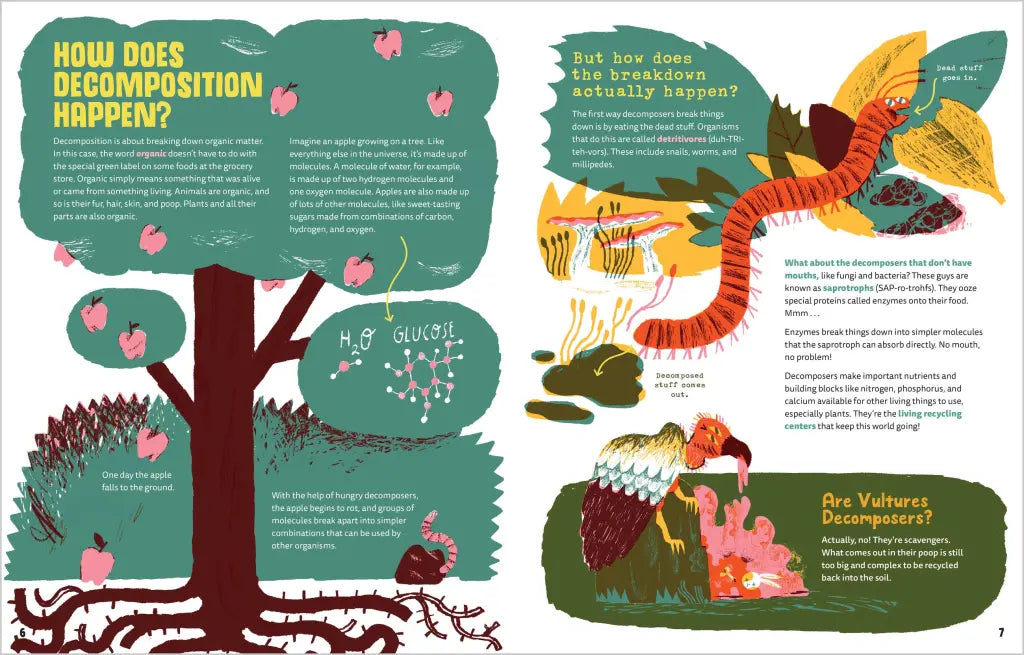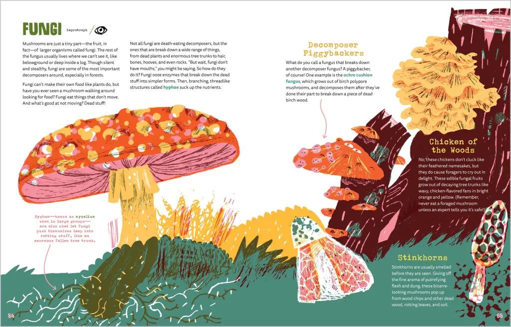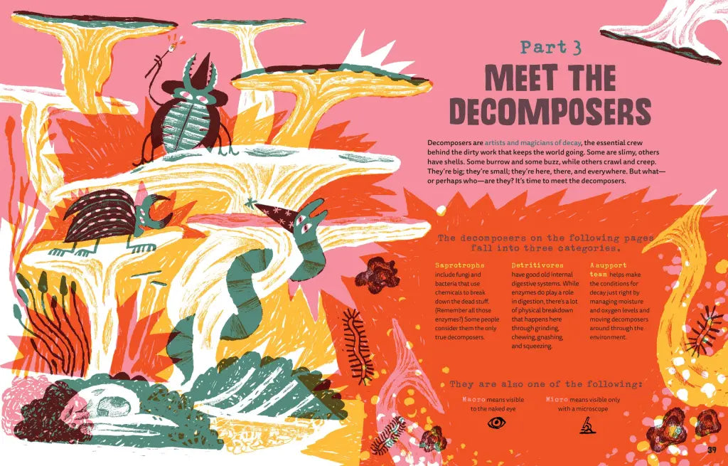 With a touch of humor and quirky full-color illustrations, kids will learn about the life-recycling system happening all around us—in the sea, in the soil, and even inside our own bodies. Profiles of decomposers such as hungry fungi and familiar worms, poop-slurping butterflies, and slimy banana slugs offer something to pique the curiosity of every kid. Readers will also learn the heroic role decomposers might play in fighting climate change and eating plastic.