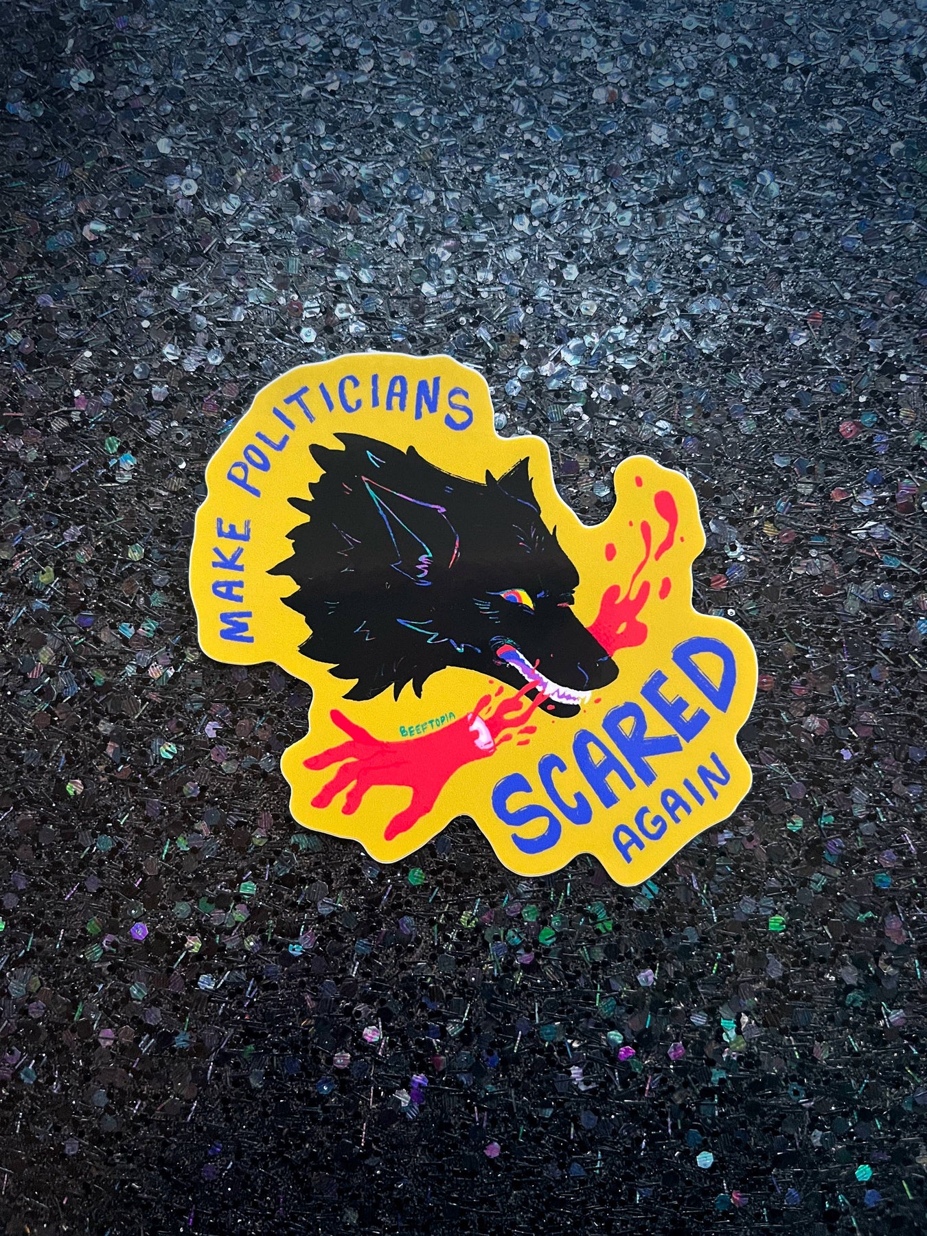 This sticker features a wolf head, biting off the hand that feeds it, alongside the words: "MAKE POLITICIANS SCARED AGAIN".