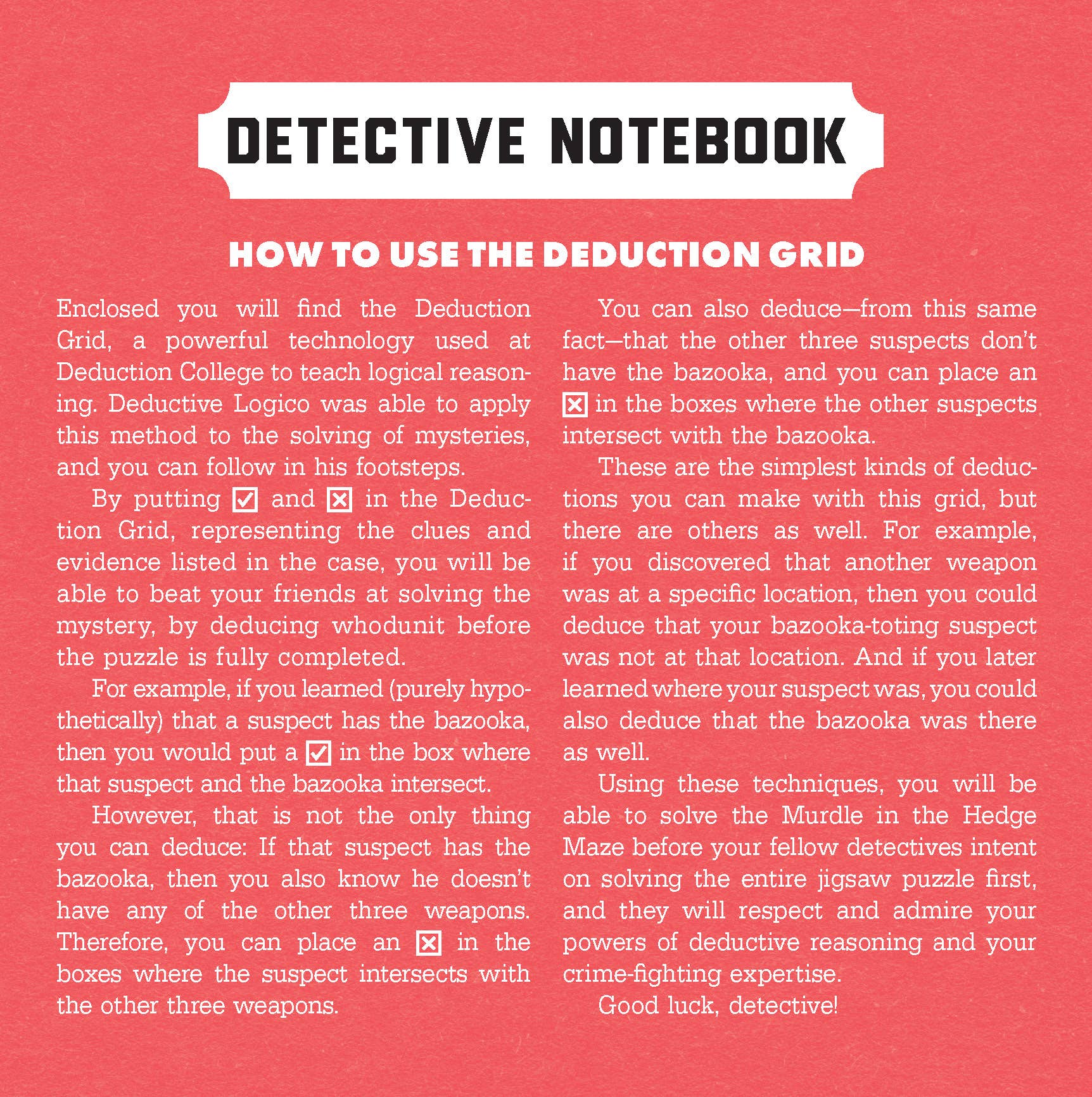 * TRIPLE THE PUZZLING FUN: Shrug on your trench coat and put on your best thinking cap because this all-new form of Murdle mystery includes a logic puzzle, a jigsaw puzzle, and a surprise maze.