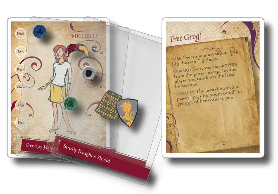 In Ren Faire, your goal is to outfit your character with costumes whose icons fill the slots on it. To do this, you play performance cards that award you coins for doing silly stunts, then buy the transparent costume cards that stack above your character card.