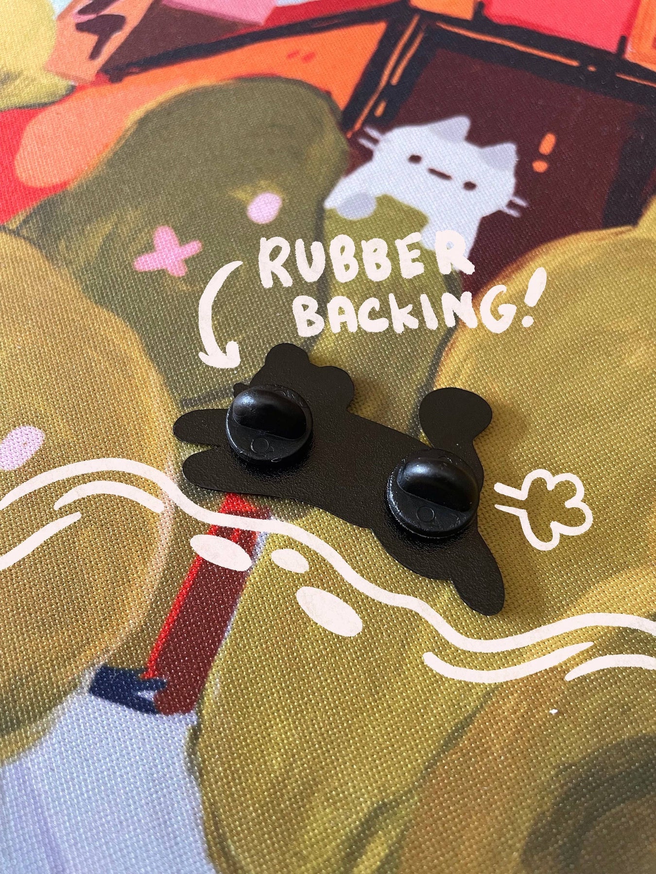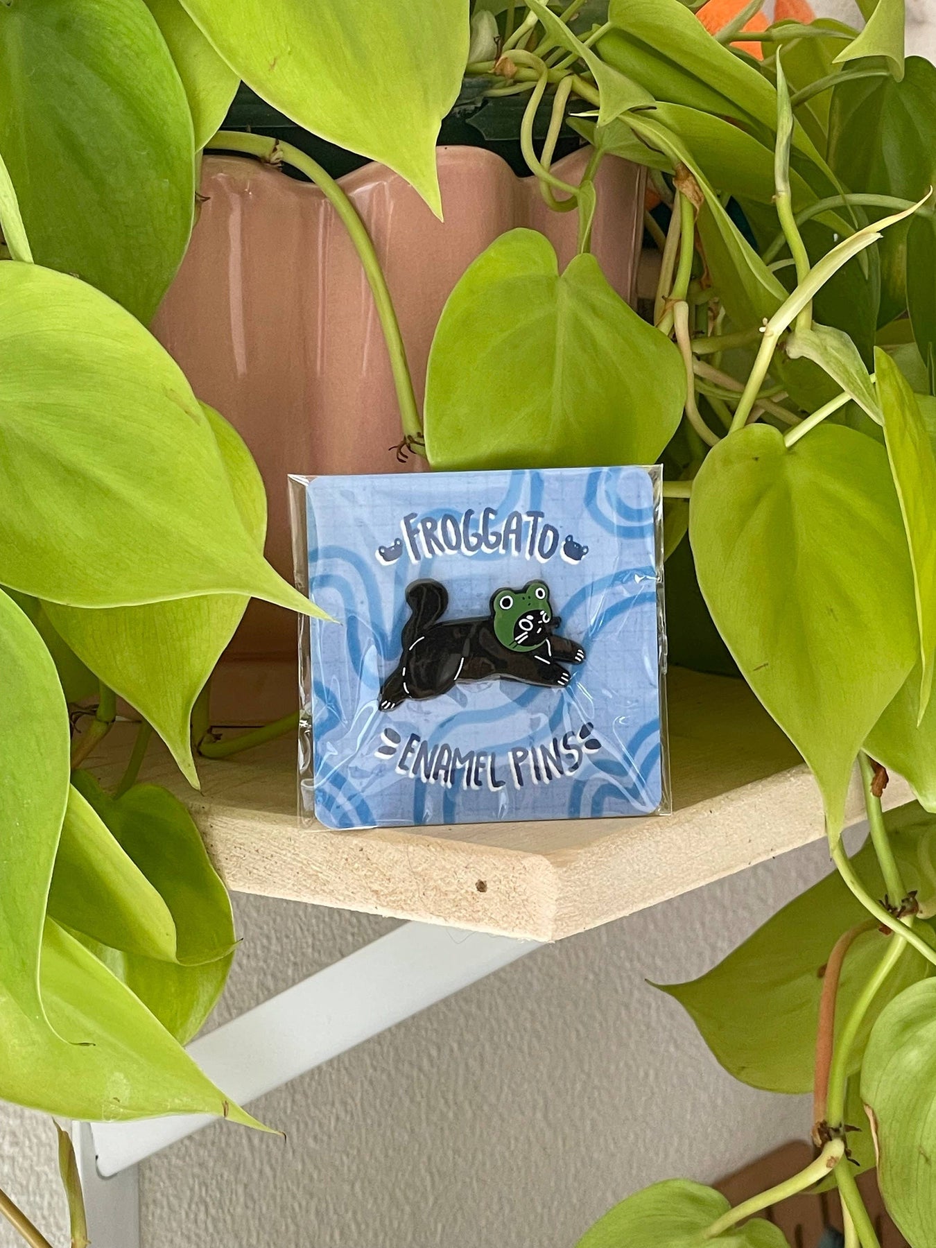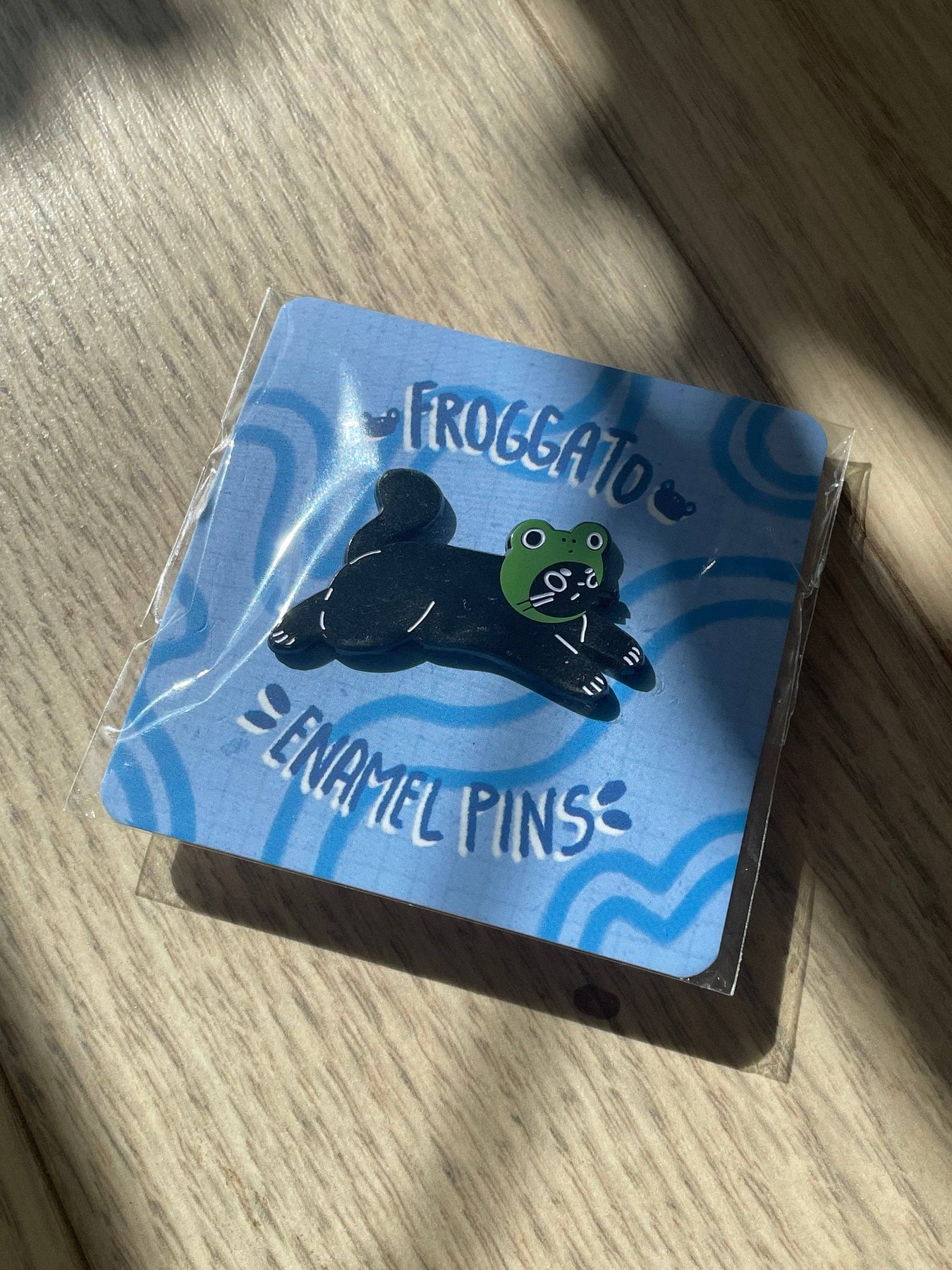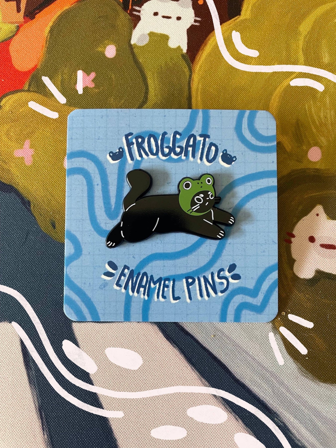 What better way to celebrate your love of cats and frogs than with an enamel pin of a cat in a frog hat?1.75” enamel pin Soft enamel with a screen-printed frog hat detail. Two rubber backing posts to keep the pin secured.