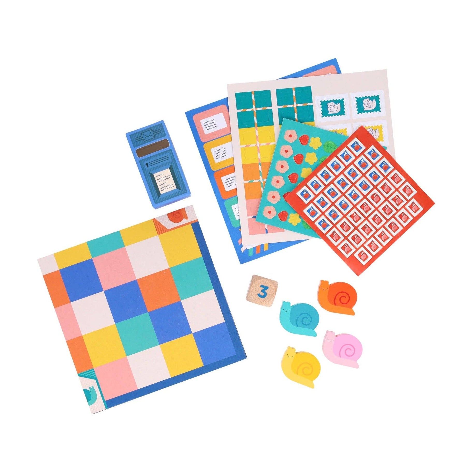 In this snail-paced mail race, players help their busy Snail Carriers collect and send letters and parcels as fast as they can. Roll the die and decide where to move. If you land on a letter or a parcel, pop it in the postbox. Or aim for an Express Delivery Stamp to zip your way straight to a letter! Be careful to avoid the other players’ mail, though, because if you post their parcel, they’ll get the points. And be sure to play nice because if anyone rolls the depot icon, they can send another player’s snail straight back to the start! When all the letters have been sent, the player with the most mail in the postbox is the winner.