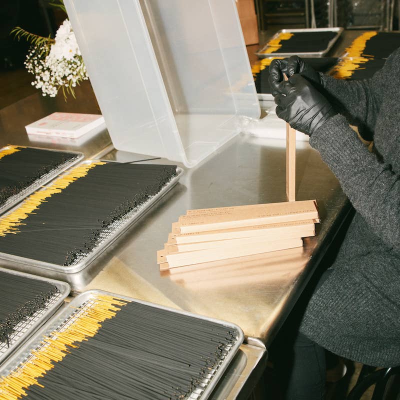 "Our charcoal-based Incense is hand-dipped in-house using fine fragrance oils and dipropylene glycol (DPG), a synthetic base commonly found in body care and home fragrance products."