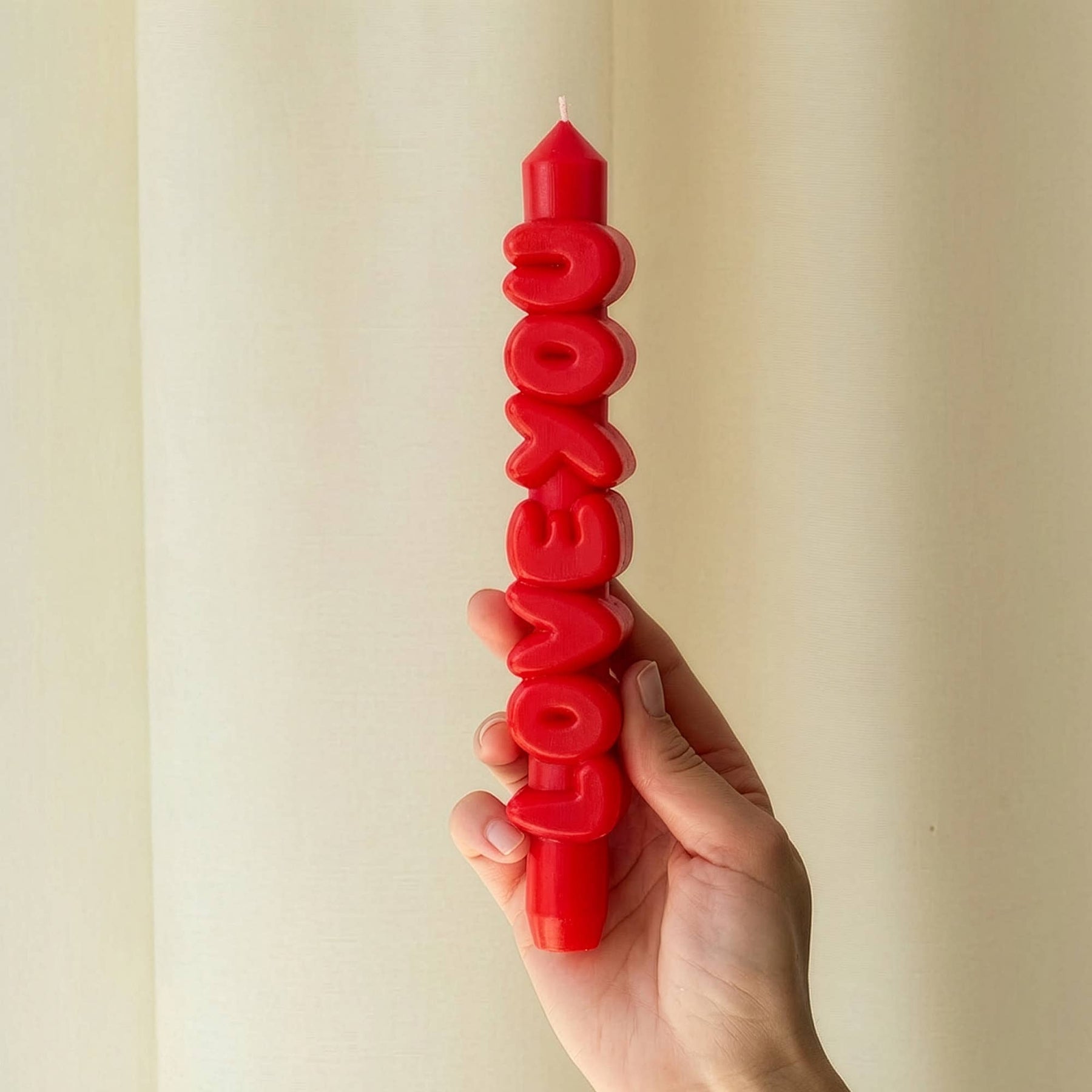 A taper candle with a clear message 'Love you'. Let the candle do the talking. This candle is made by hand from the shape right to the finish.