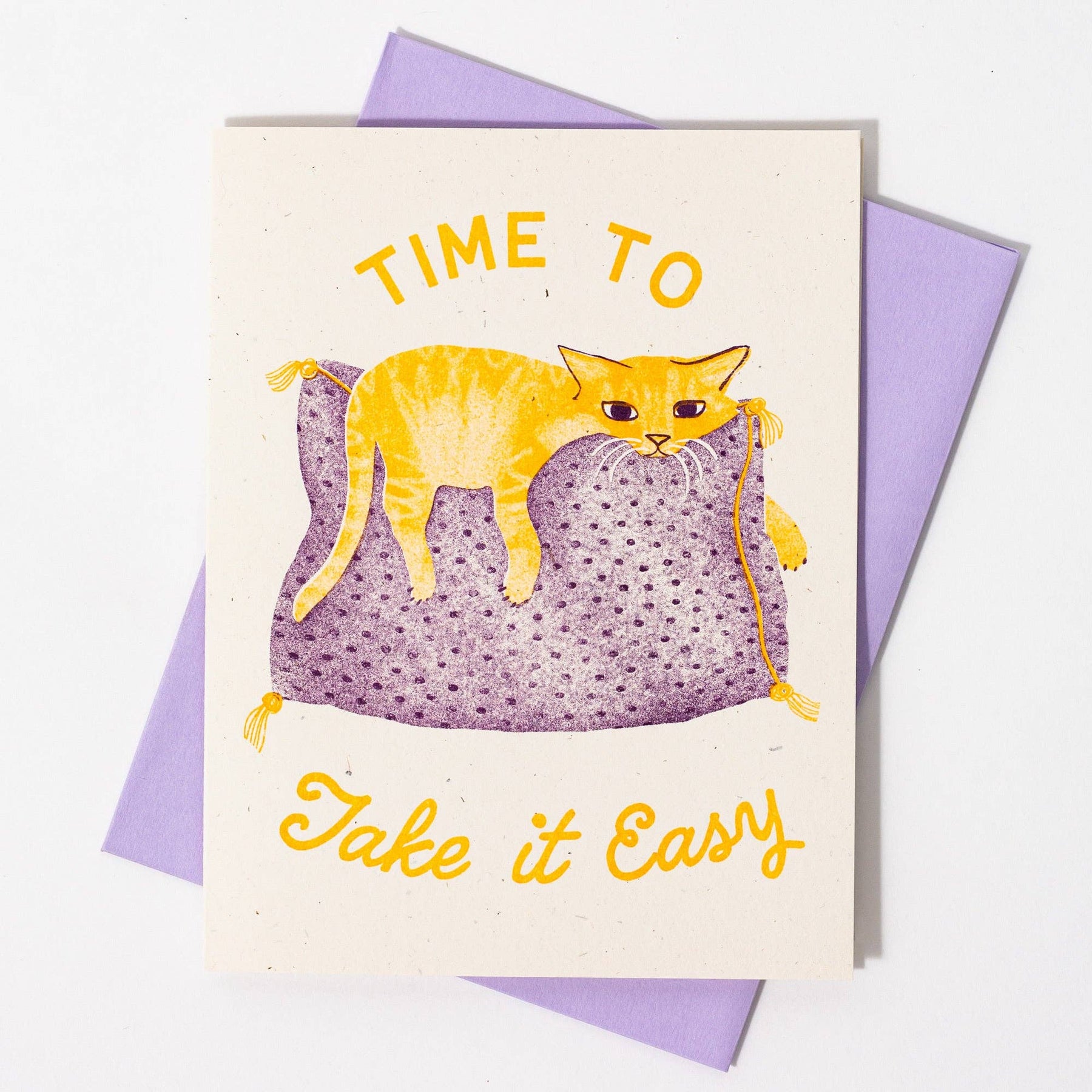 Collapse onto a plush pillow and relax like this cat — it's time to take to easy. A good card to give for retirement, sabbatical, or any well-earned rest. Risograph printed in sunflower yellow and plum ink.