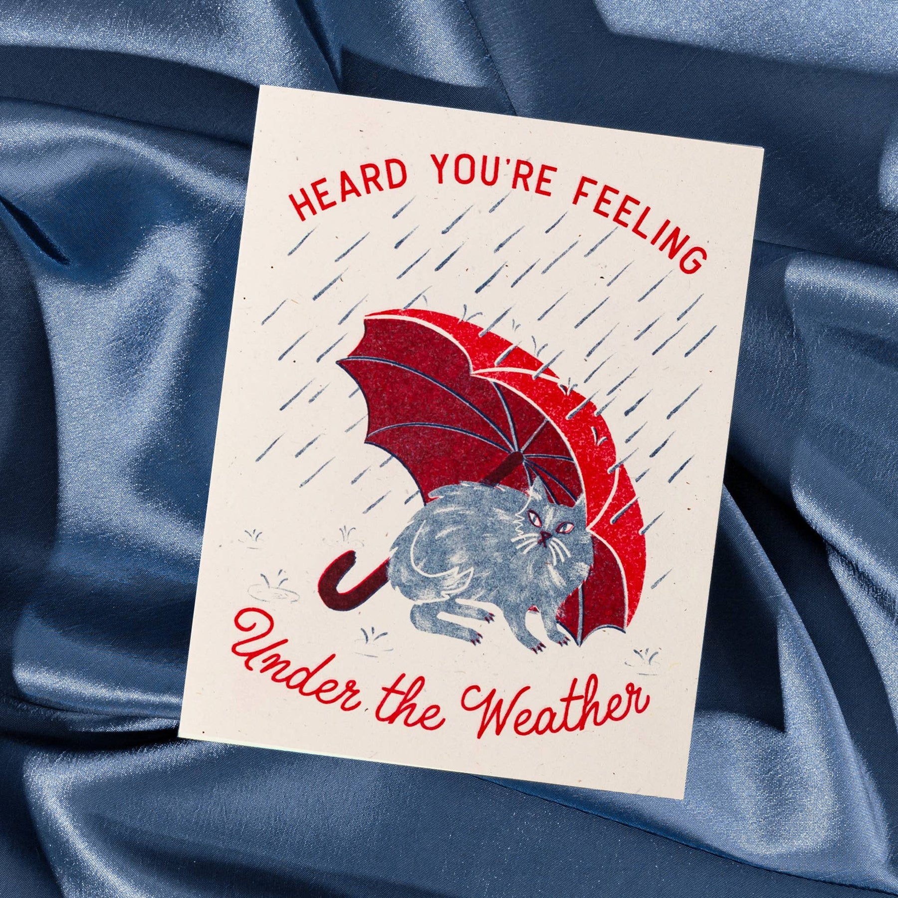 Send "Get Well" wishes with this card, featuring a cat who is sheltering from the weather under a big red umbrella. Risograph printed in bright red and federal blue.